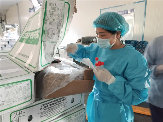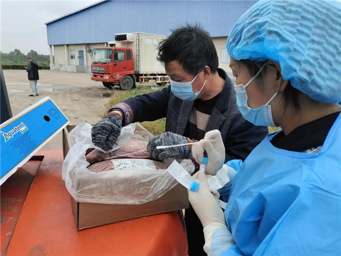 中新河南網(wǎng)5月11日電(李克選 羅曉剛 張斌 徐書(shū)輝)5月10日下午4點(diǎn),新野縣歪子鎮(zhèn)市場(chǎng)監(jiān)督管理所監(jiān)管人員聯(lián)合專(zhuān)業(yè)核酸檢測(cè)人員第一時(shí)間到達(dá)南陽(yáng)科尓沁肉制品公司,對(duì)該公司剛從巴西進(jìn)口的12噸冷凍牛肉進(jìn)行“三證一碼”現(xiàn)場(chǎng)查驗(yàn),對(duì)該批進(jìn)口冷凍牛肉和承運(yùn)裝卸人員、車(chē)輛、環(huán)境進(jìn)行核酸檢測(cè)采樣,并快速進(jìn)行檢測(cè)出具檢測(cè)結(jié)果,保障企業(yè)按時(shí)投產(chǎn)使用。