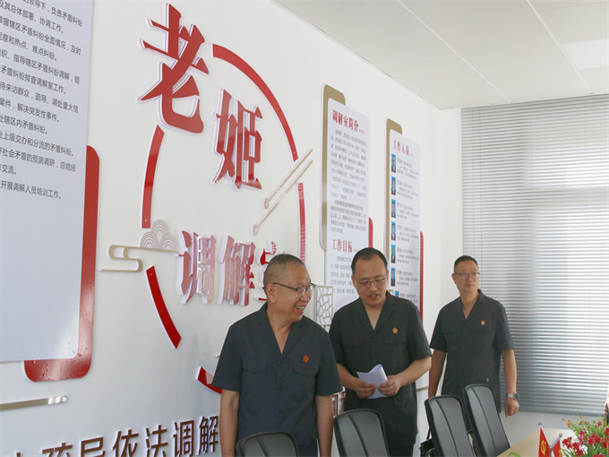 會議開始前,參會人員先到雙龍法庭進(jìn)行了觀摩學(xué)習(xí),實地了解了“姬海朝黨代表工作室”和“老姬調(diào)解室”的運行情況,并現(xiàn)場交流研討創(chuàng)建新時代“楓橋式人民法庭”的工作經(jīng)驗。