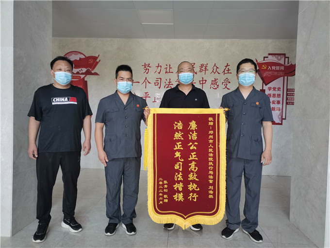 中新河南網(wǎng)6月15日電(李克選 李涵玉 朱小旭 何紅顏)6月15日上午,冒著炎炎烈日,當事人張某松來到鄧州法院執(zhí)行局將致謝的錦旗送到了執(zhí)行四團隊負責人劉浩然的手中,激動地說:“太感謝你們了,拖了這么久的欠款,真快就幫我要回來了!不愧是‘廉潔公正高效執(zhí)行,浩然正氣司法楷模’!”