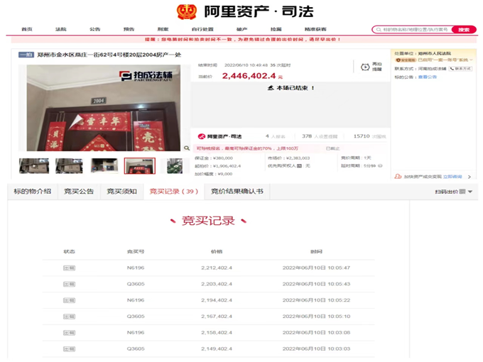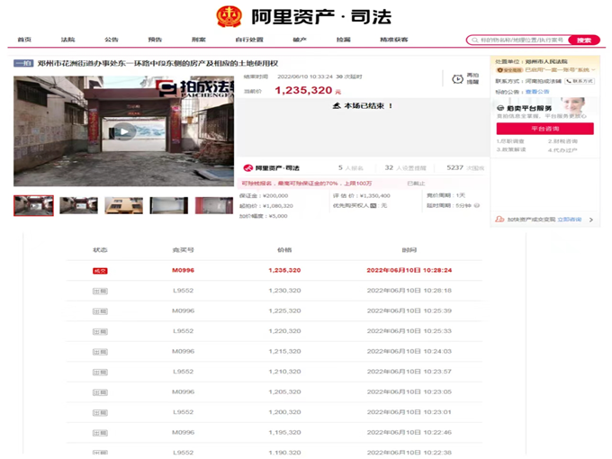 此次拍賣的兩件拍品分別是位于鄭州金水區(qū)和鄧州市花洲街道辦事處的兩處房產(chǎn)。在拍賣前期,財產(chǎn)處置團隊的法官做了大量的準(zhǔn)備工作。通過轉(zhuǎn)發(fā)公眾號、朋友圈等方式積極宣傳,提高拍賣房產(chǎn)曝光率,吸引群眾關(guān)注。在掛網(wǎng)公示期間,不少群眾來電咨詢了解情況,由于疫情等原因,拍賣鄭州的房產(chǎn)不能隨時看房,執(zhí)行法官在嚴(yán)格遵守疫情防控政策的情況下,有計劃地先后組織兩批共40余人前去實地看房;位于鄧州的房產(chǎn),一旦有群眾有參與意向,執(zhí)行法官第一時間就組織人員前去看房,先后達五十余次。拍賣開始后,兩件拍品分別經(jīng)過30余輪競價,吸引兩萬余人次觀看,最終以高于起拍價的價格成功拍賣。