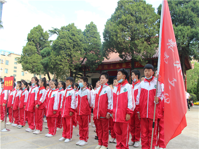 默哀畢,少先隊(duì)員獻(xiàn)唱《我們是共產(chǎn)主義接班人》,并高舉右手、齊敬隊(duì)禮,表達(dá)對(duì)先烈的敬仰,立志繼承先烈意志,報(bào)效祖國(guó)和人民。隨后,伴隨著《獻(xiàn)花曲》深情的旋律,禮兵抬起花籃,邁著鏗鏘有力的步伐,向烈士紀(jì)念塔敬獻(xiàn)花籃!