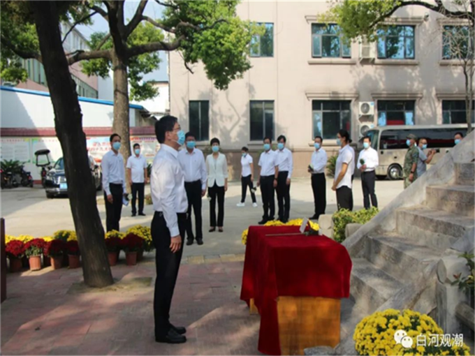 縣委書(shū)記趙紅亮,在烈士紀(jì)念塔前,為烈士整理花籃緞帶并行注目禮。